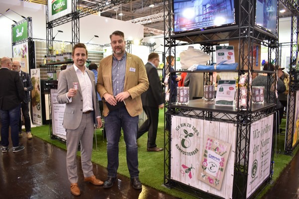 Antonio Menezes of Chrysal with Marcus Birkel of Braun, a distributor of Chrysal in Germany - presenting the compostable flower food sachets.