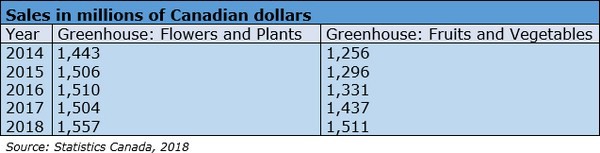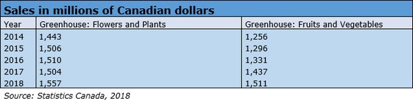 In 2018, greenhouse flowers and plants sales in Canada were mainly in potted plants (68%, CAD $831 million), ornamental bedding plants (17%, CAD $205 million), cut flowers (11%, CAD $133 million), and cuttings (4%, CAD $44 million). Most flowers and plants in the greenhouse sector in 2018 were sold in Ontario (51%), British Columbia (22%) and Quebec (22%).