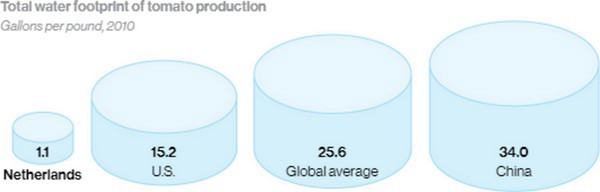 Due to the relatively high energy prices in the Netherlands, the greenhouse industry has become the most energy efficient in the world. Greenhouses in the Netherlands are efficiently controlled environments, in which water, light, energy, nutrients and temperature can be precisely managed by innovative software. This creates an optimal environment with the most favorable circumstances for the specific crop growing in the greenhouse, and even more importantly, it ensures that only the necessary amount of water and energy are used. This saves space, money and energy. It also maximizes yields: one acre of a tomato greenhouse yields 10 times the amount of tomatoes as one acre of tomatoes in a field.