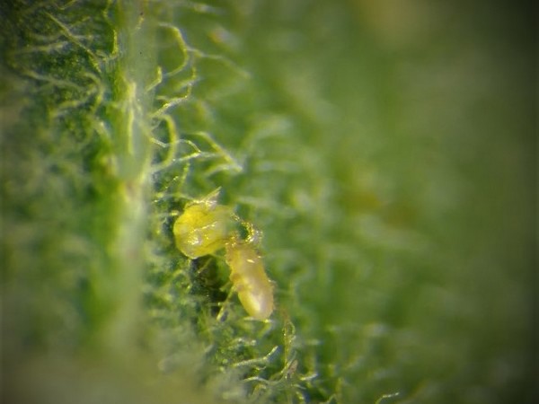 A predatory mite feeding on a whitefly nymph on the underside of a poinsettia leaf. (Texas A&M AgriLife Extension photo by Erfan Vafaie)