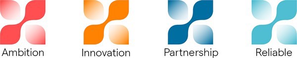 The company focuses on four core values: Innovation, Ambition, Partnership and Reliability. These values define their work method and strategy for the upcoming years and is our promise to partners and customers. In addition to the corporate green, the corporate style also uses four colours that represent a core value.
