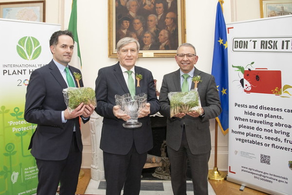 (left to right) Irish Embassy Agriculture Counsellor Finbar Brown, Irish Ambassador to the United States Daniel Mulhall, and USDA Deputy Administrator Osama El-Lissy celebrate the arrival of Ireland’s iconic shamrock plants at the Irish Embassy in Washington, D.C.