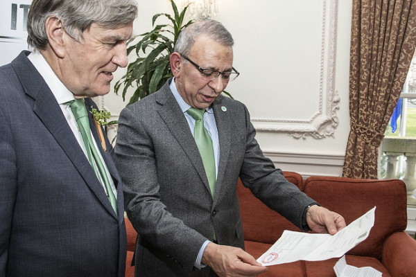 Irish Ambassador to the United States Daniel Mulhall (left) and USDA Deputy Administrator Osama El-Lissy review the plant health (phytosanitary) certificate that allowed Ireland’s gift of shamrock plants to enter the United States and become a gift to President Donald Trump on St. Patrick’s Day.