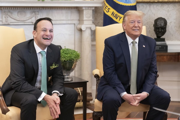 President Donald Trump (right) and Irish Prime Minister Leo Varadkar meet with reporters Thursday, March 12, 2020, in the Oval Office of the White House with Ireland’s St. Patrick’s Day gift prominently displayed between them.