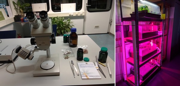 The microscope is of course an important instrument. On the right some germination tests in progress under LED