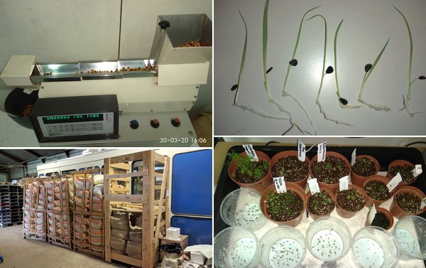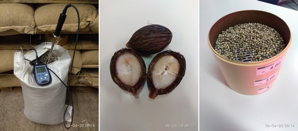 Upon receiving batches of seed, first the transport conditions are measured with a temperature recorder. Next a test batch of seeds is then cut through in the lab to expose the sprout. This is then treated with a liquid, after which the seeds darken, a way to be able to assess the vitality of the seeds.