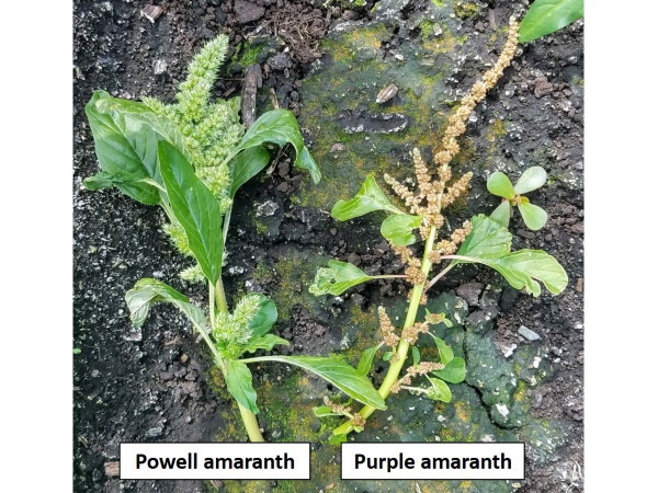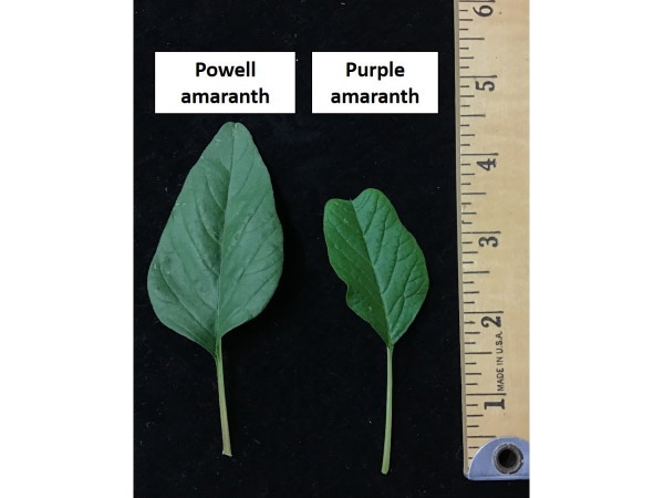 Figure 2. Purple amaranth (right) has deep notches compared to other common pigweed species like Powell amaranth (left). Photo by Erin Hill, MSU.