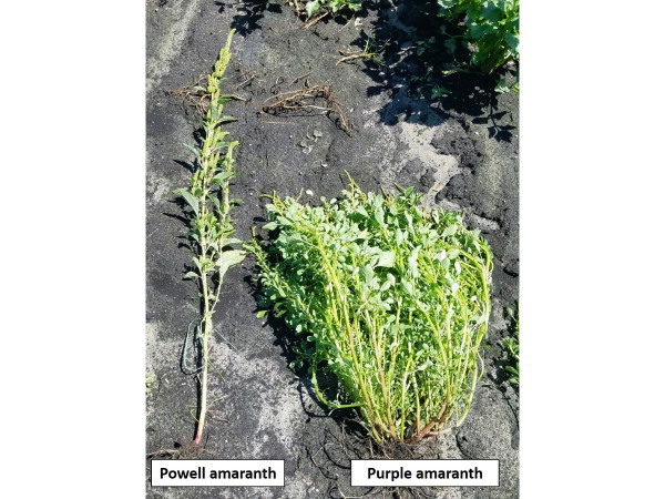 Figure 3. Purple amaranth (right) has a highly branched growth habit compared to other pigweeds like Powell amaranth (left), which generally have one central stem. Photo by Ben Werling, MSU Extension.