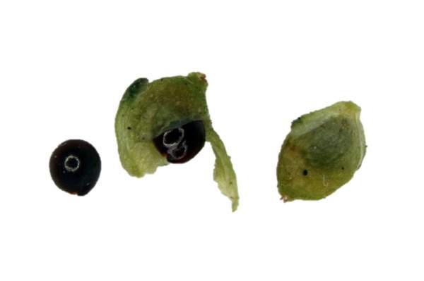 Figure 4. The seeds of purple amaranth are small black and shiny, about the size of a pinhead, and housed in a capsule, which makes them buoyant and easily seen on the soil surface. Photo by Erin Hill, MSU.