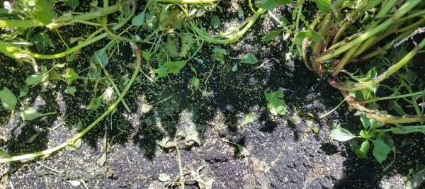 Figure 5. Many seeds of purple amaranth can be seen in their capsules on the soil surface. Photo by Ben Werling, MSU Extension.
