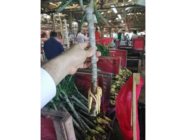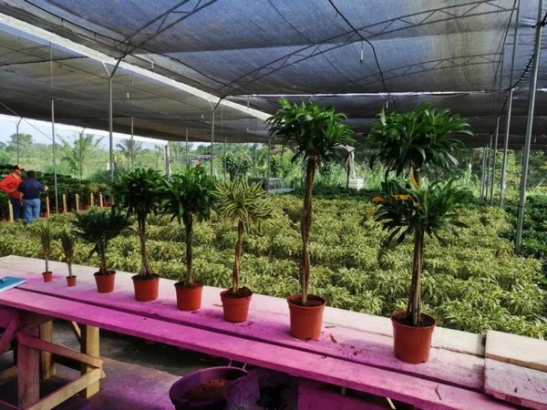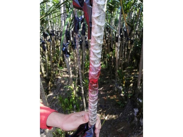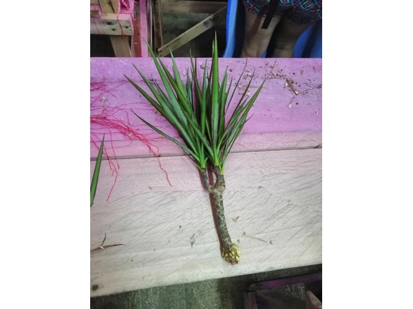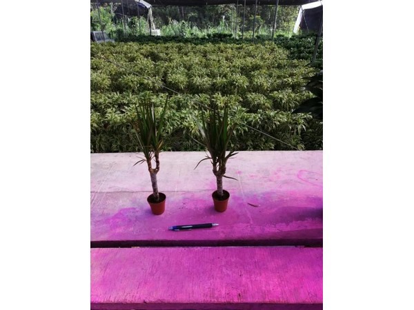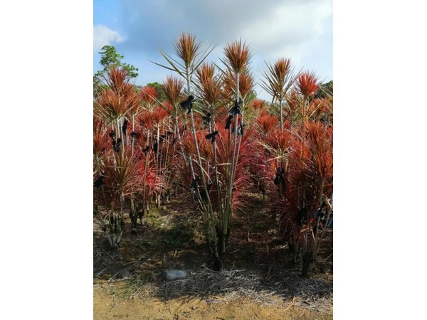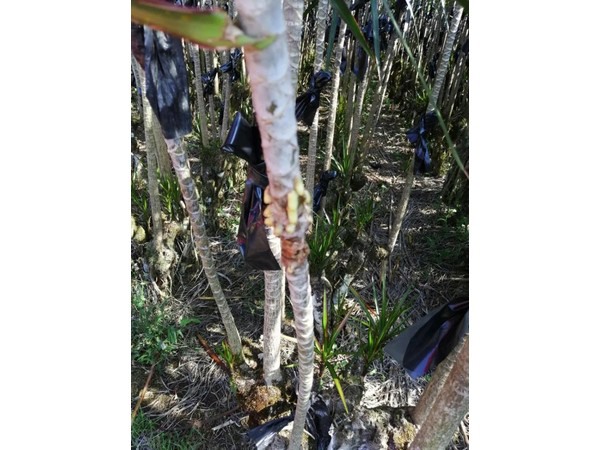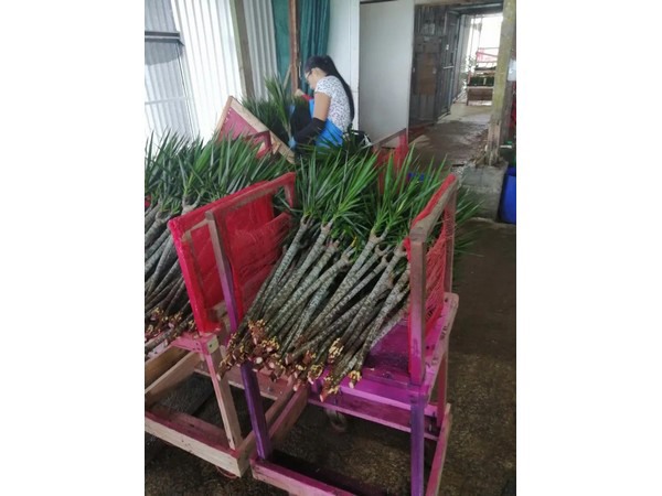 These Dracaena marginata are grown on a farm in Central America. When a parent plant is ready to be propagated, part of its bark is carved away and rooting powder is brushed onto the exposed area. The area is then coated with a layer of sphagnum moss and the entire area is sealed in plastic to keep the moisture in.