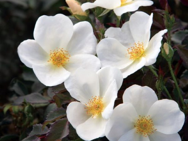 The White Knock Out Rose is an excellent shrub rose that stands out in the landscape due to the contrast between pure white blooms and very dark green foliage. It blooms from spring through fall, maintaining a compact habit.