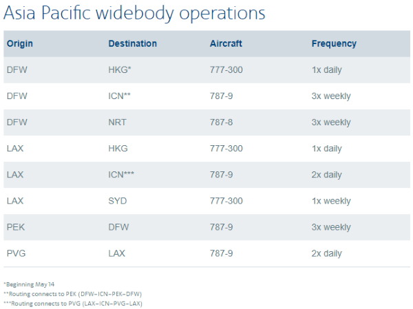 American Airlines has expanded its cargo schedule in May to provide 140 weekly flights to 15 cities in Asia Pacific, Europe and the Caribbean, up from 80 flights last week. New destinations include daily flights between Dallas-Fort Worth (DFW) and Hong Kong (HKG); and weekly flights from DFW and Beijing (PEK); DFW Chicago (ORD) and Paris (CDG); ORD and London Heathrow (LHR); Philadelphia (PHL) and Rome (FCO); PHL and San Juan (SJU), and PHL and Zurich (ZRH).