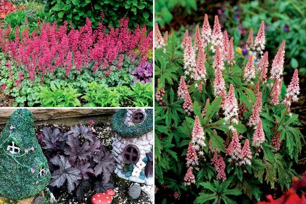 Clockwise: Heuchera ‘Paris’, Tiarella ‘Pink Skyrocket’ and Heucherella ‘Indigo Frost’.