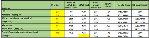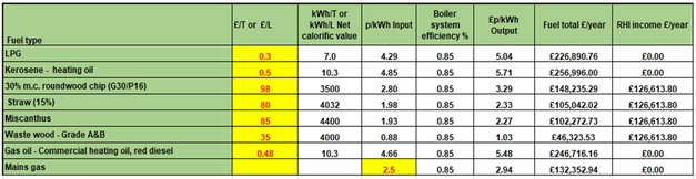 Covering a variety of boiler sizes, the following tables detail the specific cost of each fuel type, the system efficiencies as well as the inputs per kWh and the outputs achieved per £/kWh.