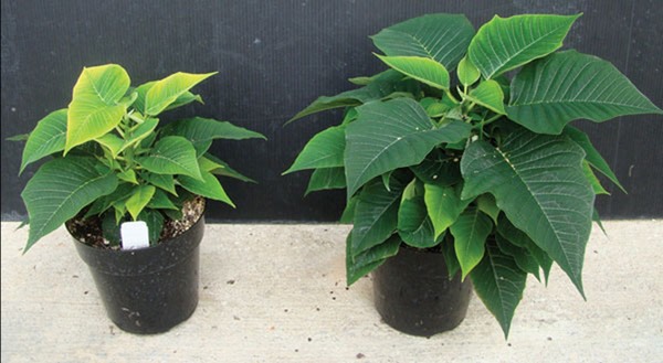 Figure 1. Poinsettia plants supplied with deficient (left) and sufficient (right) levels of nitrogen