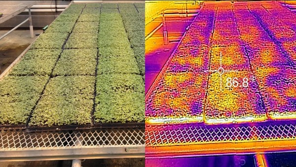 Figure 5. Leaf temperature measurement in seedling trays. Yellow to orange regions are warmer while purple regions are cooler than air temperature. This image indicates that many seedling trays need irrigation