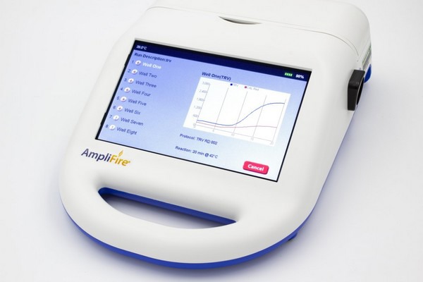 Agdia’s new AmplifyRP® XRT assay is based on recombinase polymerase amplification (RPA). This technology promotes the rapid amplification and detection of nucleic acid targets, DNA or RNA, while maintaining a single operating temperature of 39o– 42o C. The AmplifyRP® XRT products achieve target sensitivity and specificity comparable to PCR, while having clear advantages over the lab-based technology. AmplifyRP® XRT products do not require a nucleic acid purification step; crude sample extracts are prepared using a simple extraction buffer and tested directly. This makes the testing process simple and saves the end-user valuable time. When paired with Agdia’s AmpliFire® isothermal fluorometer, the XRT system is a rapid, user-friendly tool that can be implemented in the field or the lab by personnel with limited experience in molecular diagnostics (Figure 4.).