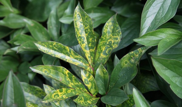 Tobacco rattle virus infects several species of herbaceous perennials, causing potentially severe disease in some species. Ornamental hosts include Astilbe, Dicentra, Epimedium, Gladiolus, Heuchera, Hosta, Hyacinthus, Paeonia, Narcissus, Tagetes, Tulipa and Vinca. Symptomology varies according to host, and many are latently infected, with the virus proliferating in the root system. Nevertheless, TRV infections can express as angular, yellow-white line patterns and ringspots on the foliage of Paeonia spp. (Figure 2.) and mottling, mosaic and necrosis on Hosta foliage (Figure 3.). Foliar symptoms can reduce the aesthetic value of ornamentals; however, it is unclear how TRV infections affect the overall vigor of asymptomatic hosts. Additional economically important host genera include Allium, several in Brassicaceae, Capsicum, Cucumis and Phaseolus.