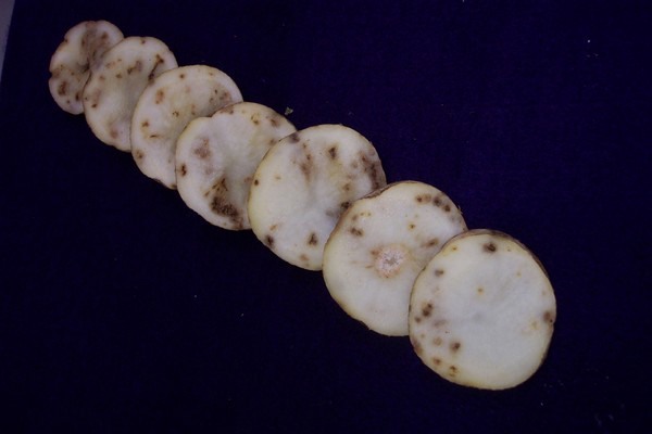 Tobacco rattle virus (Tobravirus) is globally distributed and has a wide, ever-expanding host range, infecting more than 400 species of ornamentals, vegetable crops and weedy plants. This virus causes severe disease on potato, Solanum tuberosum, known as corky ringspot or spraing. Symptoms of this disease vary according to variety and environmental conditions. Foliar symptoms are rare, but when present include leaf stunting, distortion and mottling. Symptoms on tubers are typical and include corky, necrotic arcs, rings or flecks that form on and within the flesh of the tubers (Figure 1.). Corky ringspot disease is potentially devastating to potato production as symptomology renders tubers unmarketable for chip production and fresh markets. Tuber necrosis symptoms of TRV are often confused with those caused by Potato mop-top virus (PMTV, Pomovirus), whereas ringspot symptoms on tuber skin are mistaken for Potato virus Y (PVY, Potyvirus) infections.