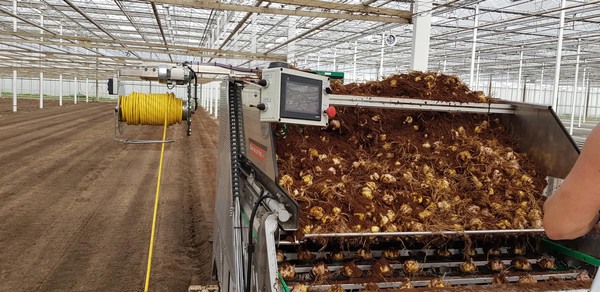 The desire to not have to move through the greenhouse on your knees to plant the crops goes way back. Planting lily bulbs is a precise and challenging job. The bulb always needs to be placed with ‘its nose pointing up’ and, if possible, all at the same depth. Over the years, there have been multiple attempts to develop an efficient and robust machine to do this job, a machine that the engineers of Hans van der Poel, together with seven growers, can now proudly present.