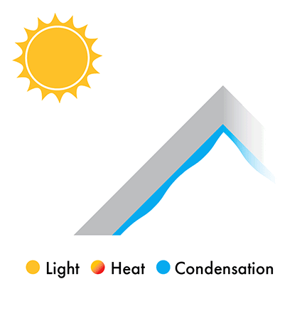 The greenhouse cover often is very wet on the inside. This is because the temperature of the glass then is below the dew point, which causes the water vapour to condense. When the droplets are large, this can reduce light transmission by 8% (for glass) to as high as 20% (for plastic). However, when the condensate forms a water film on the glass or plastic, the light loss drops considerably. But how to create a water film like this? Easy, all you need to do is apply AntiCondens. Users in actual practice experience a light gain in the order of 5%-7% with this product. This significantly benefits production in the darker months.