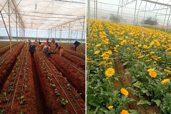 On the left: Gerbera planting at Om Sri Sai Flowers Bangalore, on the right: Gerbera Flowring at Mr Guman Singh Tomer plot Dehradun Uttarakhan recently