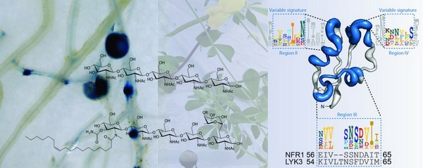 Legume plants fix atmospheric nitrogen with the help of symbiotic bacteria, called Rhizobia, which colonize their roots. Therefore, plants have to be able to precisely recognize their symbiont to avoid infection by pathogenic microbes. To this end, legumes use different LysM receptor proteins located on the outer cell surface of their roots. In the study published in Science, an international team of researchers led by Aarhus University show that pathogenic (chitin) or symbiotic signalling molecules (Nod factors) are recognized by small molecular motifs on the receptors that direct the signalling output towards either antimicrobial defence or symbiosis.