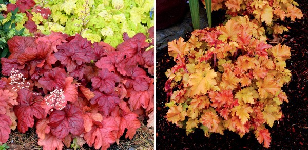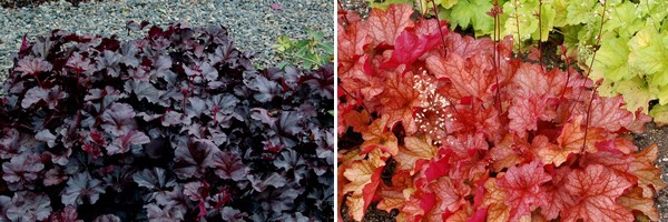 Heuchera ‘Obsidian’, and Heuchera ‘Paprika’