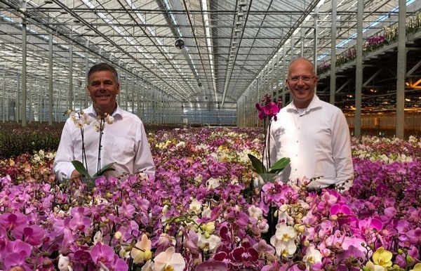 Hugo Paans (right) and Cock van Bommel (left) between the Phalaenopsis