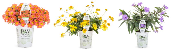 Left to right: Superbells Coral Sun Calibrachoa; Hight Noon Euryops; Machu Morado Ruellia