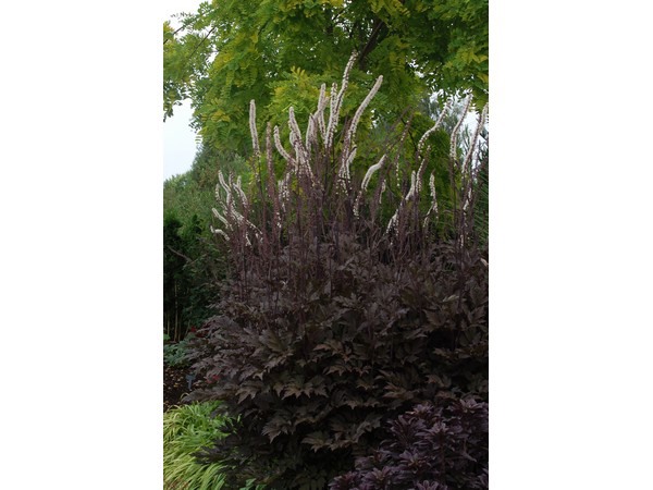Actaea ‘Black Negligee’ has lacy, black foliage that cloaks its dark stems, and an upright, clumping habit. It is a vigorous plant with purple-tinted, white flowers that project 2 feet tall and produce a scent of grape and jasmine. The foliage of this plant appears darkest when given full sun and plenty of water. It has a foliage height of 48”, foliage spread of 24” and flower height of 60”. U.S.D.A Hardiness Zones for Actaea ‘Black Negligee’ are 5-9, and its exposure allows for full sun or partial shade.