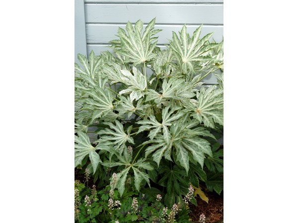 Fatsia 'Spider's Web' is a desirable, rare evergreen that has broad, palmate leaves with white splashing and dotting. The variegation changes with the seasons and as the plant ages. According to Pavlich in the video of this perennial, it always has a flowy, spider web foliage effect, whether it is in the sun or shade. It produces white flowers with black berries in the winter. This plant can be grown in the garden or as a houseplant, and can add bold texture, interest and drama to containers and mixed borders. It has a foliage height of 60”, foliage spread of 48” and flower height of 65”. U.S.D.A Hardiness Zones for Fatsia ‘Spider’s Web’ are 7-9, and its exposure is full and partial shade.