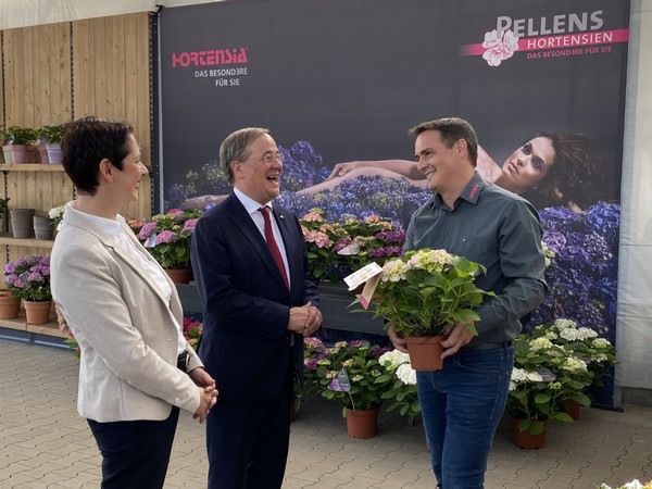 The two black limousines caught one’s eye even with the blue lights turned off, as they stopped in front of the company Pellens Hortensien in Geldern, Germany, this Tuesday (22.9.2020). Out of the car stepped Armin Laschet, Prime Minister of Nordrhein-Westfalen. Due to an invitation from Silke Gorißen, candidate for becoming county commissioner in the county Kreis Kleve, he found his way to visit the company. The two politicians took an hour to inform themselves about issues that currently concern the gardening sector.