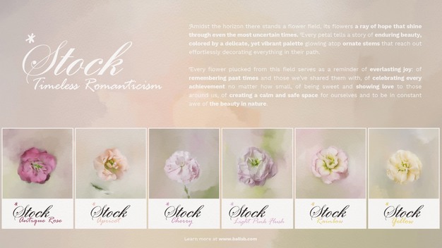 Stock Timeless Romanticism consist of 6 pastel colored Stocks; Antique Rose, Apricot, Cherry, Light Pink Blush, Rainbow and Yellow. "This color palette takes you back to the XIX century Romantic stories and scenes and transcends beauty throughout time."