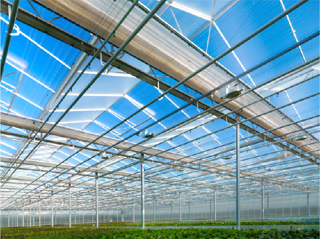 SmartGlass is a diffuse floatglass touted for its increased smoothness, strength, distribution and diffusion of light, and its “adaptive haze”. Whereas condensation typically results in higher haze and less light transmission, Michiel explains that “SmartGlass effectively reduces haze when wet and increases hemispheric light transmission. This is especially important during the winter, when light levels are lower and the glass is almost always wet”. SmartGlass is also unique in that its surface is etched and hydrophilic, making it ultrasmooth and ensuring that condensation or rainwater forms a film rather than droplets. “Water droplets on glass can cost growers up to 6% of incoming light whereas a water film saves 1- 2% of such light,” according to Michiel, SmartGlass allows growers to maximize natural light conditions in a greenhouse. As a rule of thumb in greenhouse vegetable production, an additional 1% of light can effectively improve yields by 1%, making SmartGlass’ increased light transmission an investment that pays for itself.