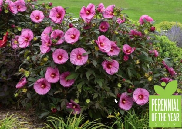 Hibiscus 'Berry Awesome' is 2019 Proven Winners National Perennial of the Year. 'It is a Hibiscus hardy to zone 4. This plant gets nicknamed “dinner plate Hibiscus” because the flowers on this plant are a huge 7-8” wide. ‘Berry Awesome’ has lavender pink flowers and red eye, with contrasting deep midnight green foliage. Flowers are produced from the top to the bottom of the plant, rather than just at the top like some other cultivars. The foliage forms the perfect habit and will be ready to show off from late summer into early fall. ‘Berry Awesome’ is the perfect backdrop or centerpiece for sunny borders.' Click here for more information.
