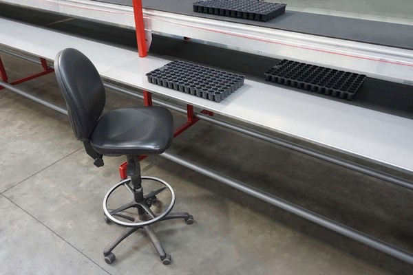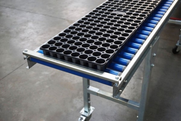 When the empty trays are filled with substrate, they are taken off. "The full tray rolls to the back of the planting line. As you can see in the picture, there's a roller conveyor at the end of the planting line. The full tray rolls onto the roller conveyor. When there are too many trays on the roller, the whole machine stops. There's always a sensor that's ensuring that everything runs smoothly," says Rob.