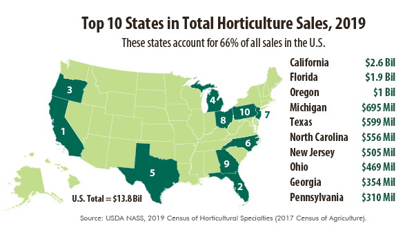Horticulture production occurred primarily in 10 states, which accounted for 66% of all U.S. horticulture sales in 2019. California ($2.63 billion), Florida ($1.93 billion) and Oregon ($1.02 billion) led the nation in sales.