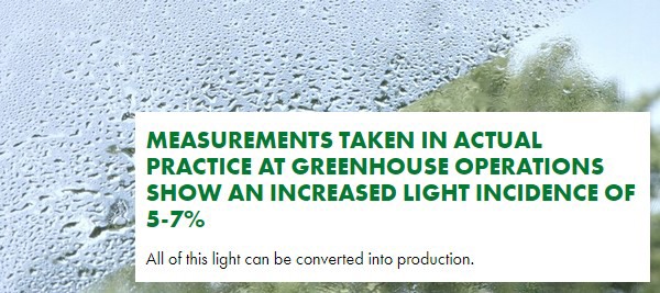 This is the desired situation. This allows the light to enter the greenhouse to a higher degree, where it can benefit the crop. Measurements taken in actual practice at greenhouse operations show an increased light incidence of 5-7%. All of this light can be converted into production.