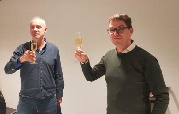 Herbert Wooning (left) and Arco van der Kaaij raise their glasses after Green’05 acquires Wooning Orchids.