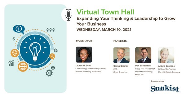 It is important to stay agile, innovative and open-minded to grow your business in any year, but with the uncertainty of the past year it has never been more important to embody these characteristics for the success and survival of your business. In this week’s PMA Virtual Town Hall, companies both within and outside of the fresh floral and produce industry shared their expertise on how to expand your thinking and fine tune leadership to grow your business. Panelists Carlos Oramas, CEO, Gems Group, Inc.; Don Sanderson, Group Vice President Foods and Meijer Express, Meijer; and Angela Santiago, Chief Executive Officer, The Little Potato Company joined PMA Chief Strategy & Membership Officer, Lauren M. Scott to discuss lessons learned from the case studies of companies that have expanded their thinking to grow their product line, operations, and teams.