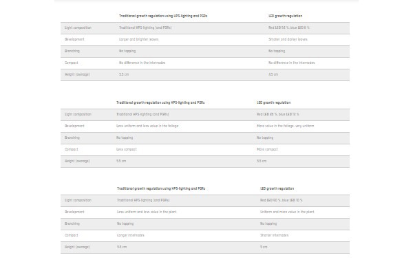 The tables below show the test results for the Sunny Osteospermum variety Emma. The three tables show how the light combinations have impacted the plant. Note that the only changes in growth regulations are the combinations of LED-lighting – controlling light combinations is easily managed using Senmatic’s LED controller or their climate control. The reference plants have all been treated with PGRs six times and have been placed under traditional HPS-lighting. It is worth noticing that even with a non-controllable, permanent LED light plan, remarkable results were experienced.