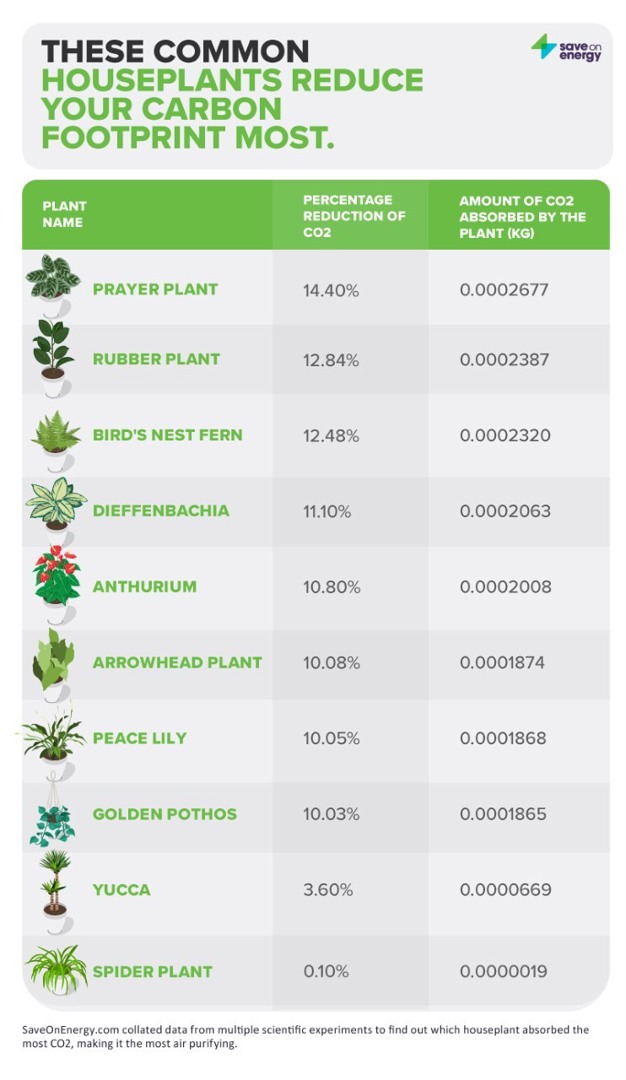 SaveOnEnergy.com/uk compiled data from two comparable studies to find out about the quantities of CO2 certain plants are able to absorb: ‘Effectiveness of Indoor Plants to Reduce CO2 in Indoor environments’, and ‘The Influence of House Plants on Indoor CO2’.
