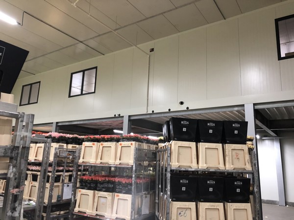 Ultimately, an office was realized in the top of the cold store. The office has been placed on a storey floor made of a four-meter-high steel construction, the construction team shares. The floor is insulated and the walls are made of sandwich panels so that it could be built quickly and efficiently with the correct insulation value.