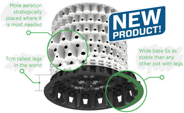 Plantlogic has released numerous designs for specific crops, all aimed at achieving proper drainage and oxygenation. Examples include our newest pot, the Zephyr V2. we believe that the Zephyr has the highest legs, widest base, more oxygen uptake of any product in the world now.