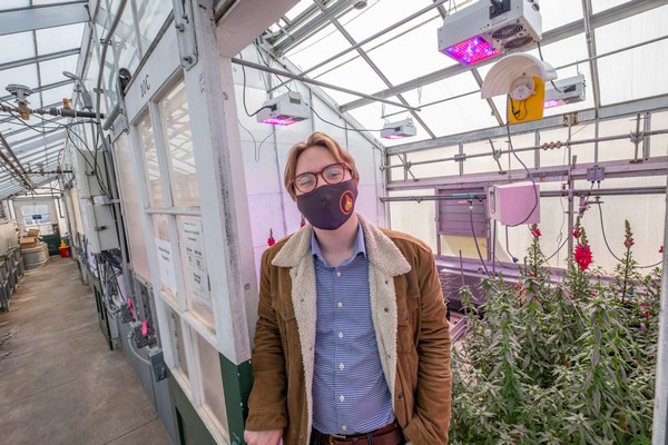 MSU graduate student researcher Caleb Spall stands outside a greenhouse compartment where snapdragons are starting to bloom under LEDs. Credit: Derrick L. Turner