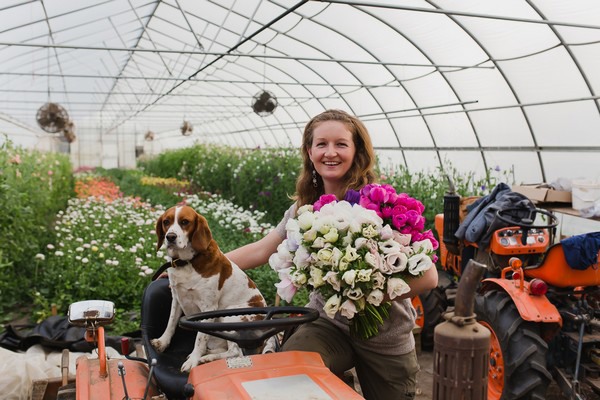 MSU graduate Lindsay Daschner and her dog, Tater, pose with cut flowers grown in her greenhouses at Forget Me Not Farms. Credit: Blue Stone Photographs