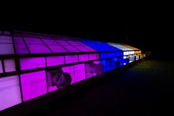 MSU's research greenhouses at night, glowing in purple, blue, white and yellow as scientists study the effects of different lighting on different plants to help Michigan's growers. Credit: Derrick L. Turner