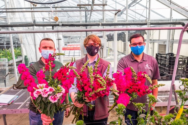 Nate DuRussel, Caleb Spall and Roberto Lopez (from left to right) hold up cut stock, snapdragon and godetia flowers grown in MSU’s greenhouses. Credit: Derrick L. Turner